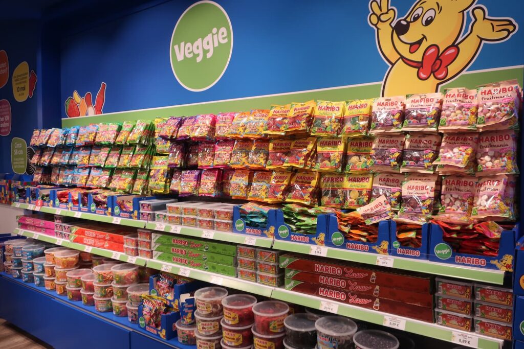 ハリボーの公式ショップで販売されているのは様々な種類のハリボーです。ドイツではベジタリアンの人が多く、動物性のゼラチンを使ったグミを食べられない人もいます。そこでベジタリアンに対応したグミがありますが、こちらではベジタリアン対応のグミの商品が充実していました。