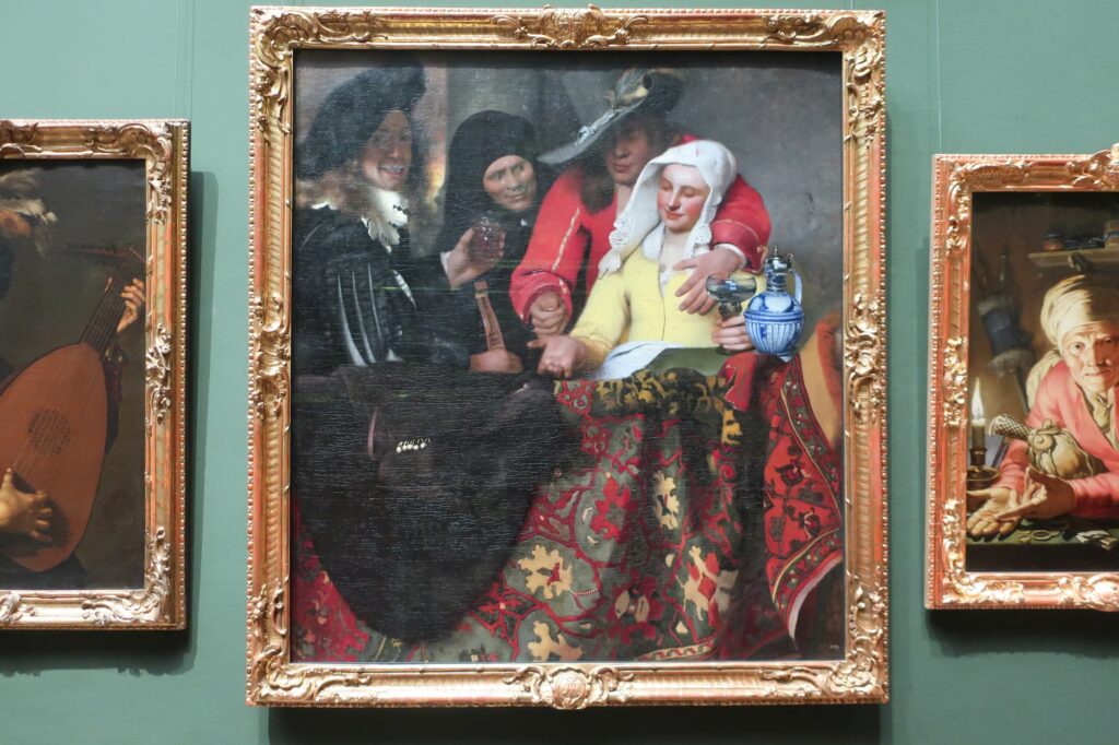 こちらはベルリンの絵画館にある作品「紳士とワインを飲む女」とよく似た構図になっています。部屋には絵画が掛けられ、窓にはステンドグラスが嵌め込まれています。そして女性が持つのはワイングラス。大きな違いはそこに二人の男性が描かれていることです。こちらの作品はベルリンの作品を見比べると面白いので、合わせて見ておくと良いでしょう。